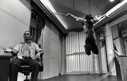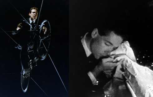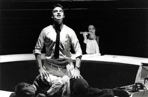 A man is ensnared by his double, as action and dialog simultaneously interweave across two rooms, side-by-side.