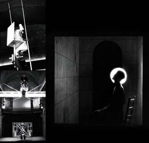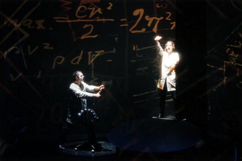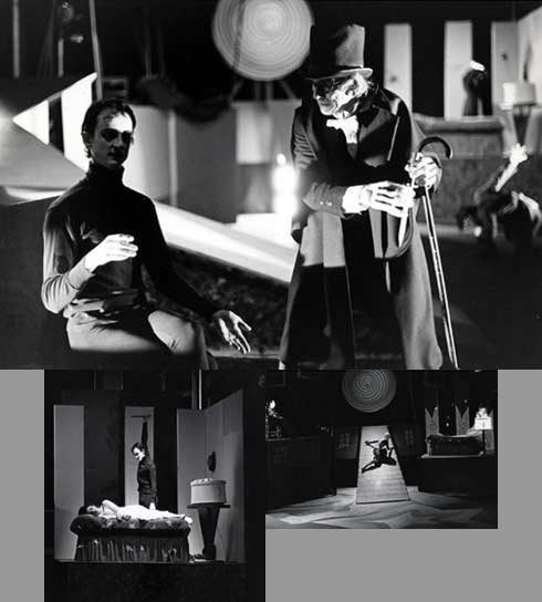 The stage as a kinetic canvas for light, well defined space, and color, in which painted figures—Red Man, Yellow Lady, and Blue Man—struggle for control over the image.