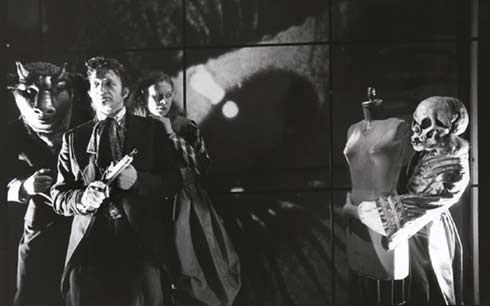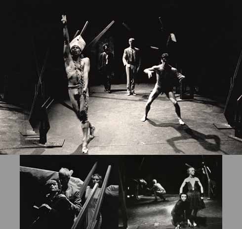 Max Ernst “wrote” his surrealistic collage novel, Une Semaine de Bonté, ou Les Sept Éléments Capitaux in 1934. He transposed the art of collage into the form of the novel. These images which do not mirror consensual reality generate thousands of words when we try to resolve them, but just look at them and soon the habit of words, the appetite for meaning, abates and one is in a vast, rushing free fall. We generated this piece by exactly recreating on stage thirty-nine of the collages, and then inventing the actions that led into and out of them to form a continuous flow.